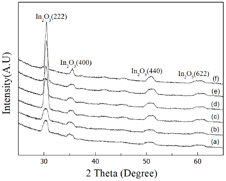 while the characteristic diffraction peak for crystalline TiO2 did not appear, even at electron irradiation of 1500 eV. Table 2 shows the observed grain size of the In2O3 (222) plane using the Scherrer equation [16]. The average grain size with electron irradiation at 300, 600, 900, 1200, and 1500