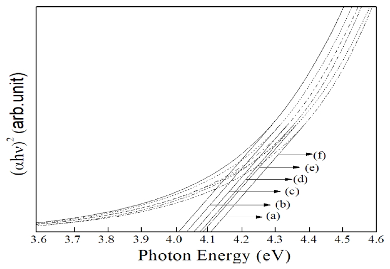 where hν is the photon energy and A is the absorption edge width parameter. In Fig 5, the optical band gap increased from 4.013 (at deposition) to 4.108 eV as the electron