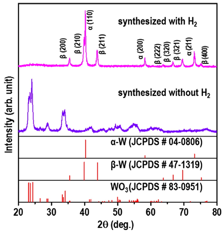 by annealing at high temperature (700 °C) in an H2 atmosphere. This is in good agreement with the work of É. Hegedüs et al. [32], who reported that the β-W phase was produced by the hydrogen reduction of W oxides