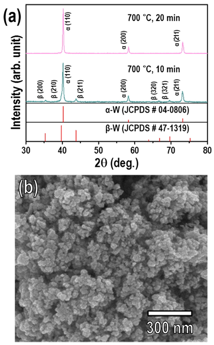 be indexed to the α-W phase without any β-W phase (Fig 9a), indicating the formation of single-phase α-W nanopowder with a particle size similar