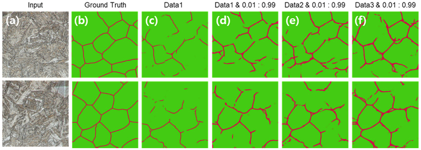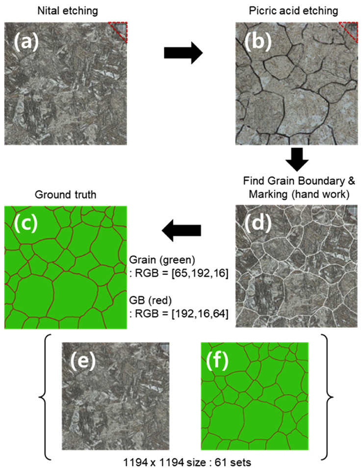 그림 3와 같이 grain matrix (Green)와 grain boundary (Red) 가 선택적으로 드러나도록 이미지를 처리하였다. 그림 3에 나타낸 바와 같이 FCN 신경망을 학습하기 위해 원본 이미지로서 나이탈 에칭된 마르텐사이트 이미지를 준비하고, 여기에 피크릭산 에칭 후 수작업으로