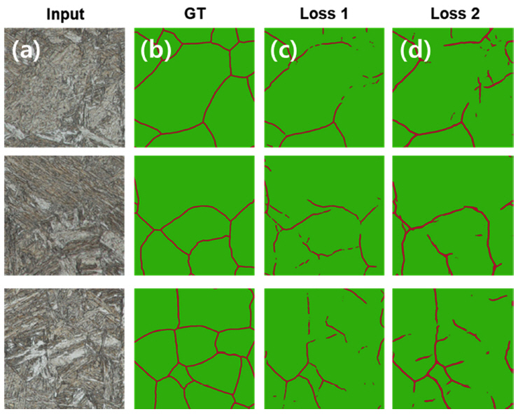 and (d) and (c) show grain boundary marking and generated ground truth, respectively.