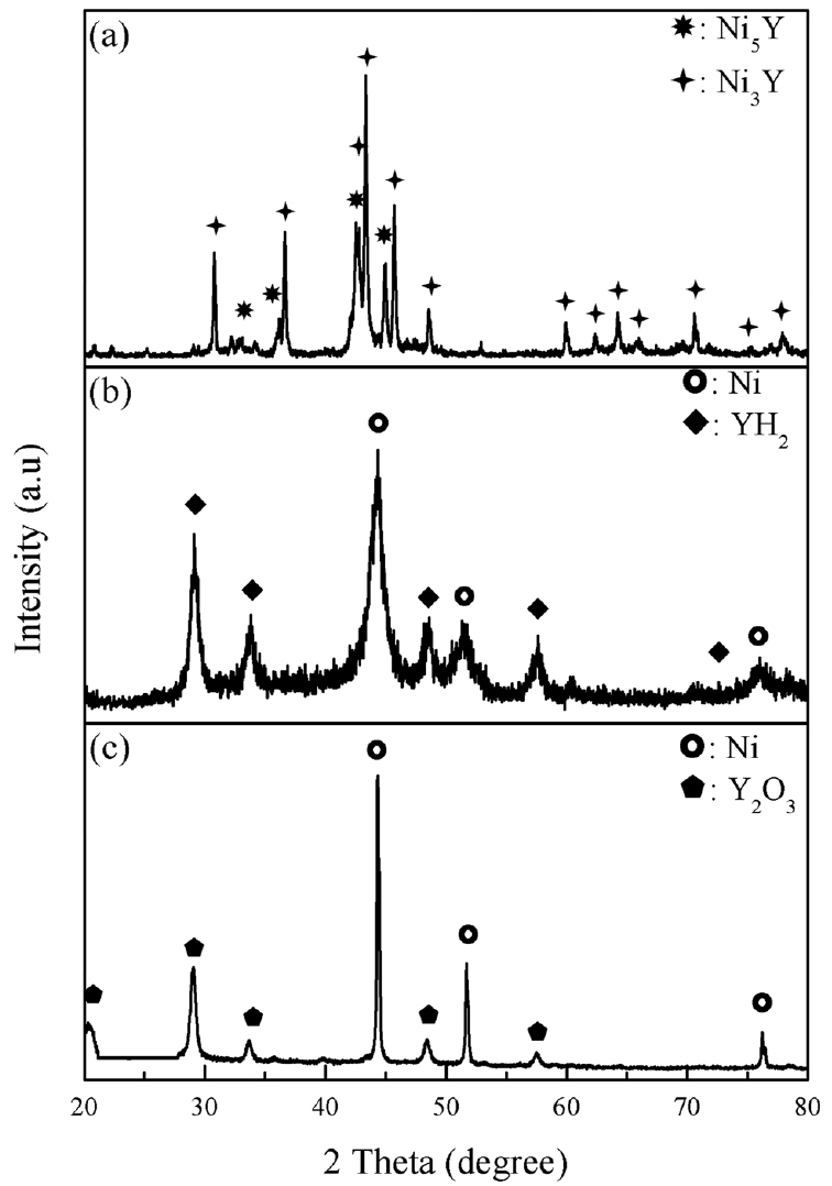 Ni4Y ingot consisted of Ni3Y and Ni5Y phases. When the alloy powder was milled under pressurized H2 gas for 25 h, only the Y element of the alloy was converted into the YH2 phase. That is, the Ni3Y and Ni5Y phases in the ingot were reformed into Ni and YH2 phases, as shown in Figure 1(b). When the Ni–YH2 powder was oxidized and reduced at 600 °C, only the YH2 phase was oxidized to Y2O3, as shown in Figure 1(c). For convenience, in the following the Ni–Cr–Y2O3 composite prepared using the new process is referred to as NCY-h, and the Ni–Cr–Y2O3 composite powder prepared using the conventional MA process is referred to as NCY-c.