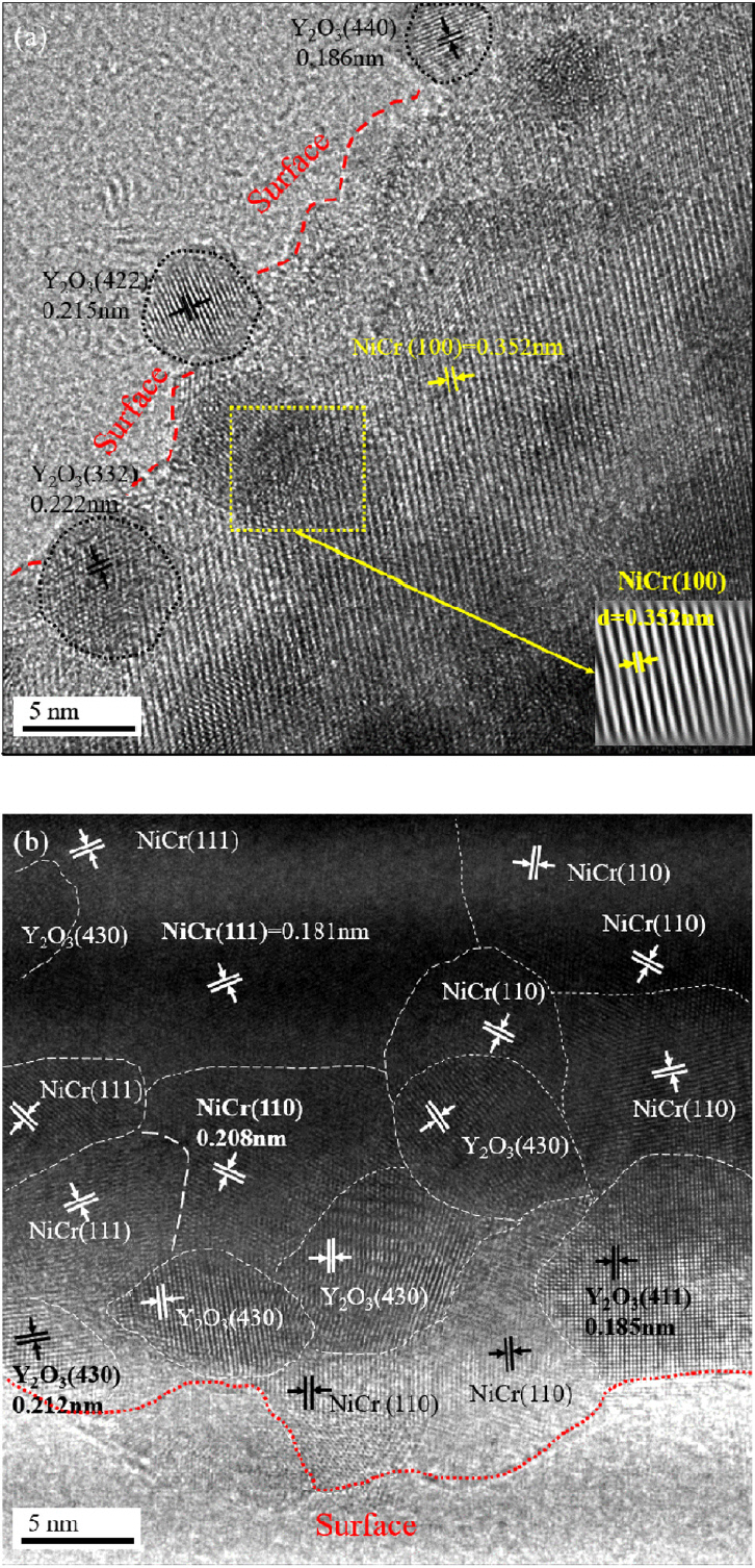 were analyzed using fast Fourier transformation (FFT). As shown in Figure 3(a), Y2O3 particles, approximately 4–5 nm in diameter, exist only on the surface of the matrix