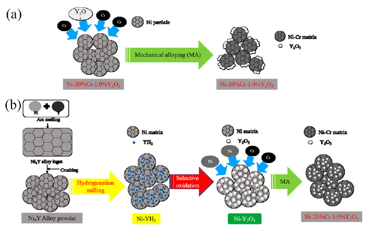 of the two metallic phases in the Ni–Y alloy into Ni–YH2 particles through hydrogenation milling, the selective oxidation of Ni–YH2 into Ni–Y2O3, and then MA of the powder with the desired composition (Ni–20wt.%Cr–1.2wt.%Y2O3), as shown in Figure 4(b). This new process was very effective in manufacturing the metallic Ni(Cr) particles