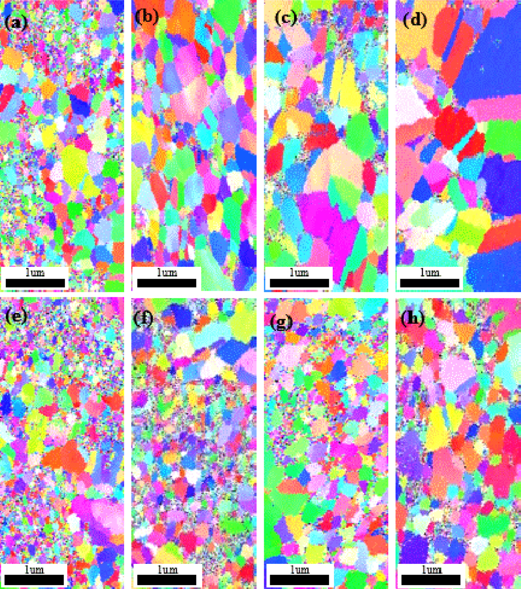 Figure 6 shows the EBSD micrographs of NCY-c sintered at (a) 850 °C, (b) 900 °C, (c) 950 °C,