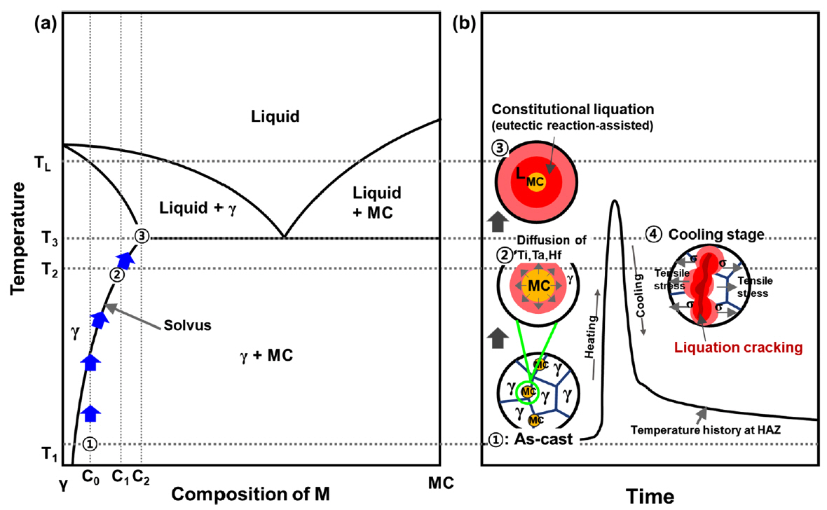 liquation) 현상을 나타내는 것으로 잘 알려져 있다 [10,11,16,17,20,30,33]. 해당 결과들을 본 연구에 적용하면 그림 11과 같이 γ/MC 경계에서의 조성적 액화 및 액화균열 발생을 설명할 수 있다. 그림 11(a)는 γ–MC의 pseudo 2원계 상태도, (b)는 용접 시 γ/MC 경계에서의 조성적 액화 및 액화균열 형성 과정을 모식적으로 설명하고 있다. 주조
