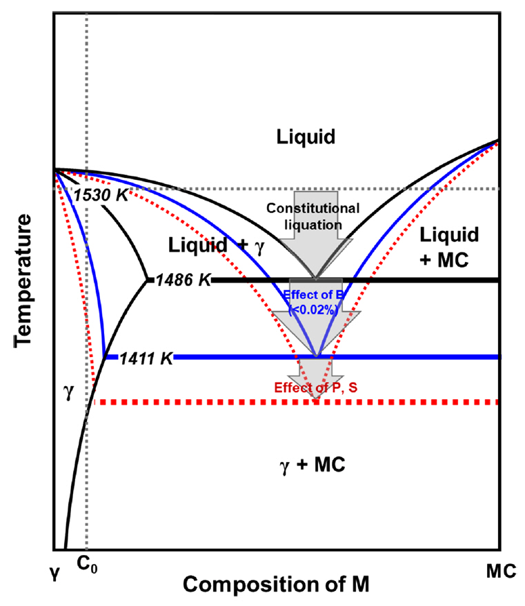 Schematic description for effect of B and P, S on pseudobinary diagram of γ-MC.