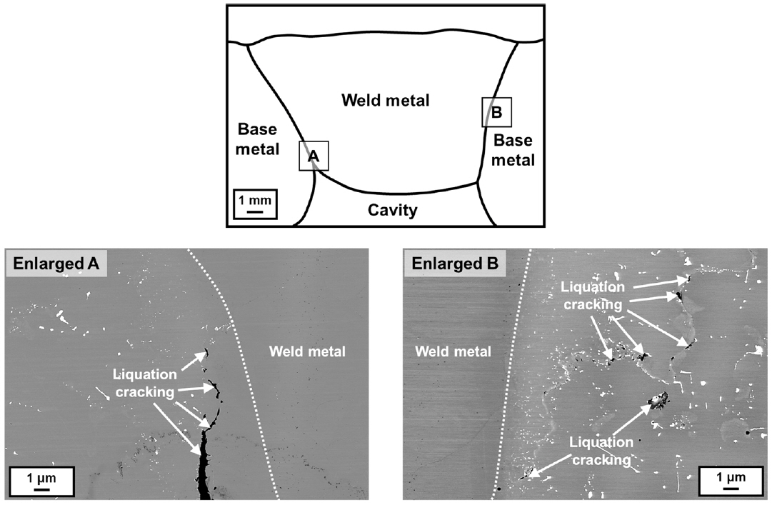 균열, 기공 등의 결함이 확인되지 않았다. 하지만 열영향부 (모식도 상의 “A” 및 “B” 영역)에서는 BSE 사진과 같이 다수의 고온균열이 확인되었다