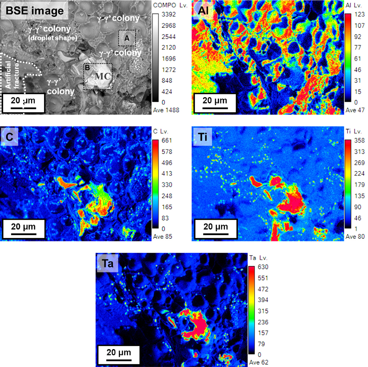 그림 3은 CM247LC 합금 블레이드의 후방산란전자(back-scattered electron, BSE) 영상 사진 및 주요 합금원소의 분포거동을 나타내고