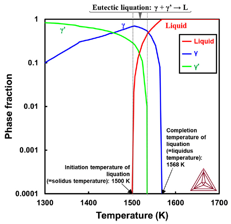γ-γ’ 조직 액화시작 온도(=고상선 온도) 1500 K(1227°C)는 CM247LC 합금의 평형 상태 액화 시작온도(=고상선 온도) 1530 K(1257°C)
