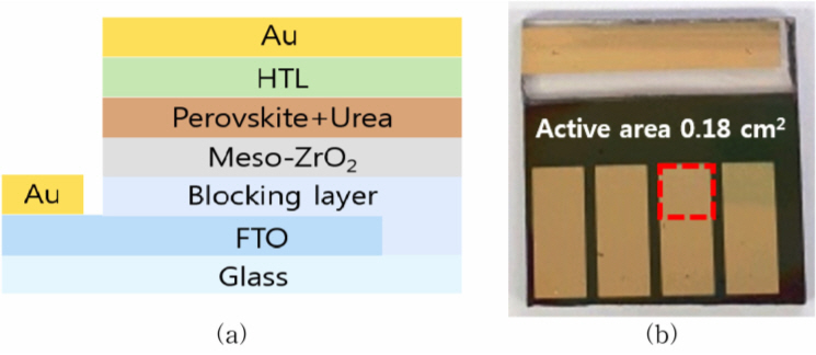 본 연구에서는 오직 ZrO2 층만 이용한 전자전달층을 채용하고, ZrO2 층 두께에 따른 PSC의 광전기적 특성을 확인하고자 하였다. 이에 따라 그림 1(a)에는 glass/FTO/blocking layer(B.L)-TiO2/ZrO2/6 mM urea perovskite/Hole transport layer(HTL)/Au electrode 구조의 소자 모식도를 나타내었으며, 최종