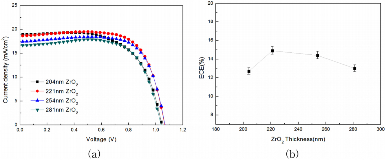 그림 2에는 meso-ZrO2 층 두께에 따른 PSC 소자의 I-V 그래프와 ECE 변화 그래프를 나타내었다.