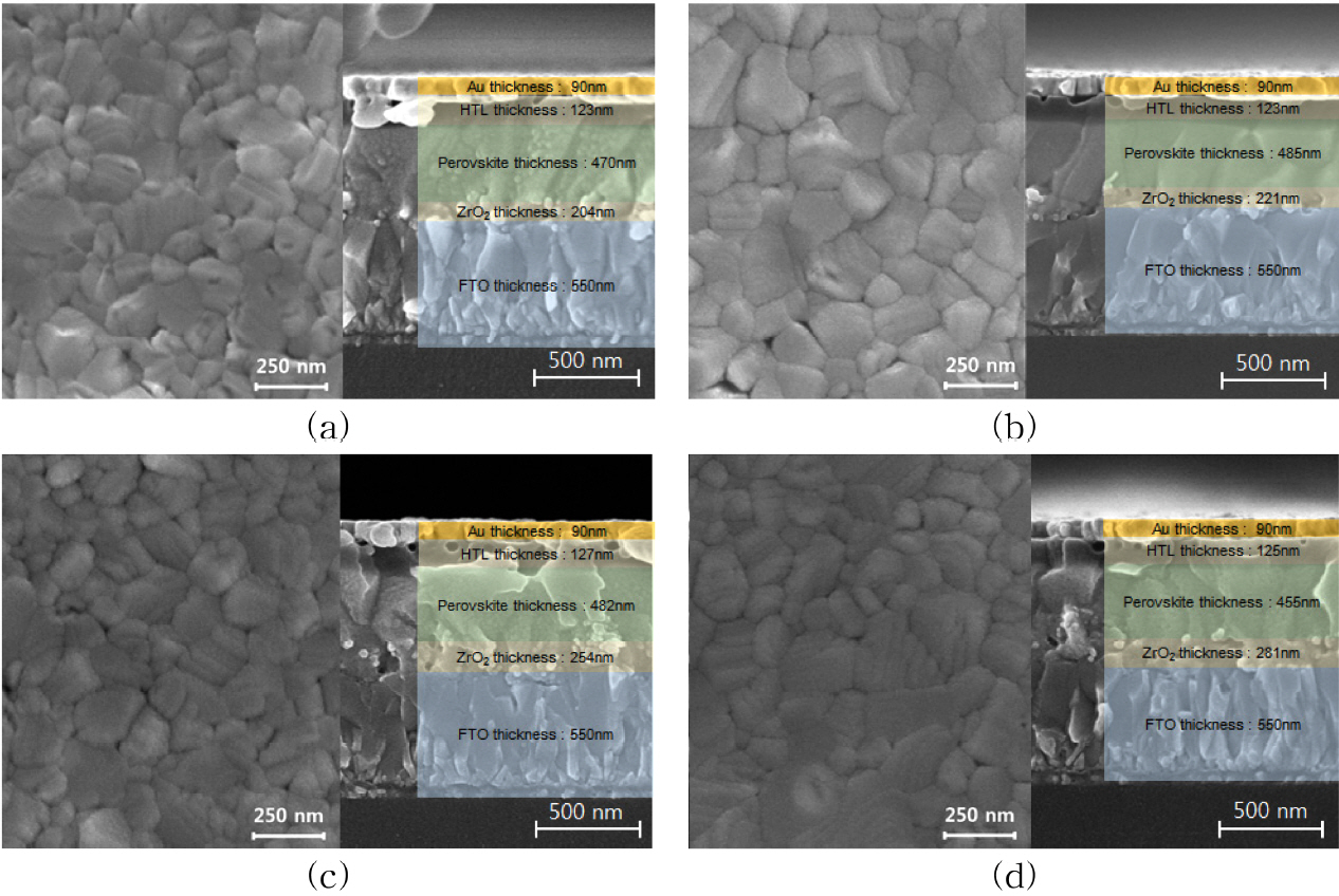 FTO/ZrO2/perovskite/HTL/Au 구조를 확인할 수 있었으며, 페로브스카이트가 meso-ZrO2 층에 균일하게 흡착되고 성장하여, 약 470 nm 페로브스카이트 층을 확인할 수 있었다.