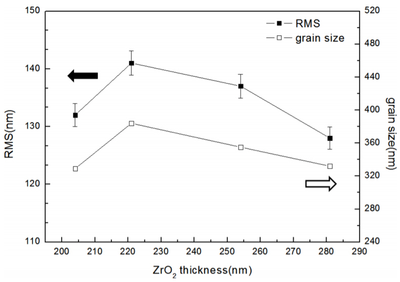그림 4에는 ZrO2 층 두께에 따른 표면거칠기(RMS)와 결정립 크기 변화를 같이 나타내었다. 204, 221, 254, 281 nm ZrO2 두께의 표면거칠기는 그래프 좌측에 나타낸 바와 같이 각각 132, 141, 137, 128로 증가하다가 감소하였다. 우측에 나타낸 이때의 평균 결정립