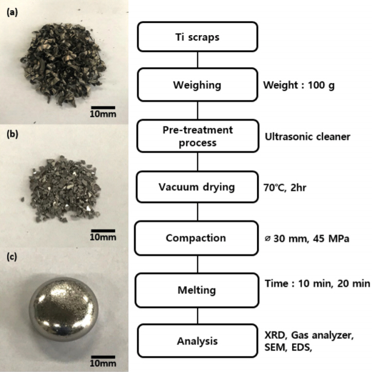 Next, ferrotitanium ingots were prepared by melting the pre-treated Ti scraps along