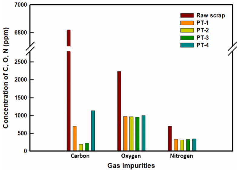 The gas impurities in the Ti scraps before and after pretreatment are shown in Fig 4. The gas impurities were mostly contained in cutting oil adhered on the surface of