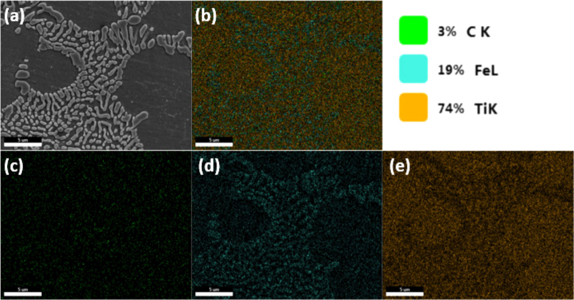 melted by PAM for 20 min are shown in Fig 7. As can be seen from the maps, (d), Fe was distributed in the matrix; however, it