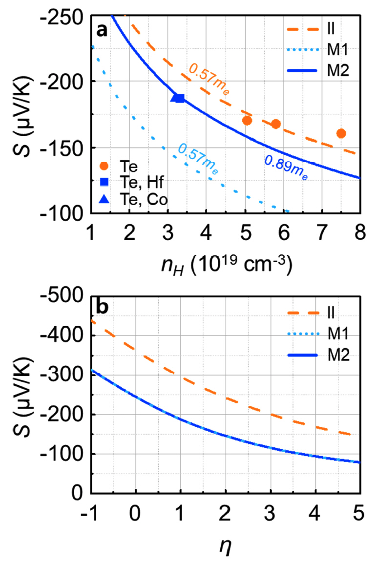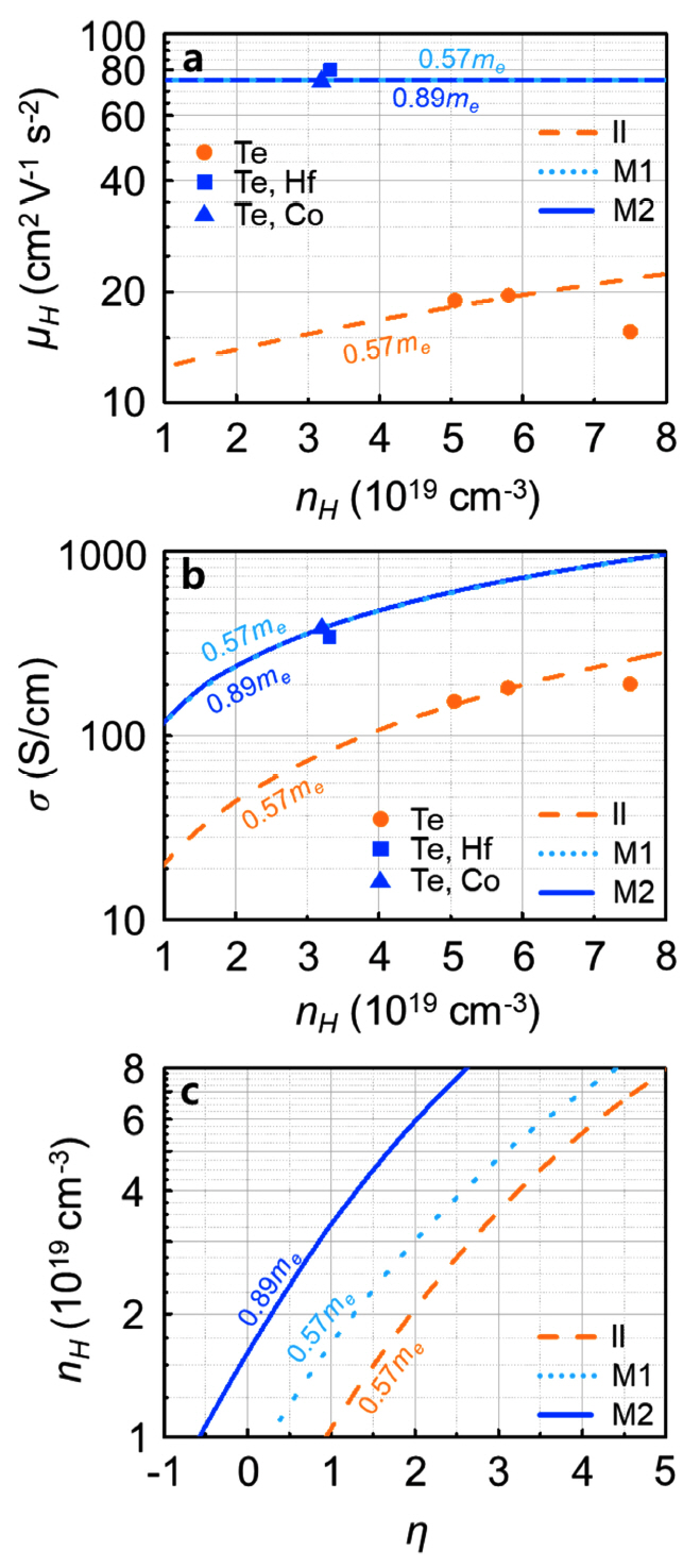 모양)의 nH에 따른 S 측정값을 나타낸다 [6,8]. “Te”의 경우, II 산란을 가정한 SPB 모델 피팅을 통해 밴드의 md*로 0.57 me (전자의 정지 질량)를 얻었다 (“II”, 주황색 파선). “Te, Hf”와 “Te, Co”의 경우, Mixed 산란을 가정한 SPB 모델 피팅