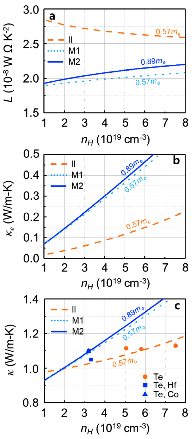 그림 3(b)는 II 산란이 지배적일 때 nH에 따른 κe (“II”, md* = 0.57 me) 및 Mixed 산란이 지배적인 경우의 κe 계산값을 보여준다 (“M1”와 “M2” 각각 md* = 0.57 me 및 0.89 me). 그림 3(a)에서 “II”의 L이 “M1” (혹은 “M2”)의 L 보다 그 값이 컸지만, “M1”의 σ가 “II” σ 대비 전 nH 구간에서 약 5배 높기 때문에 (그림 2(b) 참고) L과 σ의 곱에 비례하는 κe 경우 “M1”가 “II” 대비 큰 것으로 계산되었다. “M2”의 L이 “M1” 보다 소폭 크기 때문에, κe 또한 “M2”가 “M1” 보다 크다. 만약 Te와 전이금속의 동시 도핑을 통한 md* 증가분을 고려하지 않고 “II”와 “M1”만 비교해 본다면 캐리어 산란 메커니즘을 II 산란에서 Mixed 산란으로 제어하는 것은 κe의 증가로 이어지는 것을 볼 수 있다.