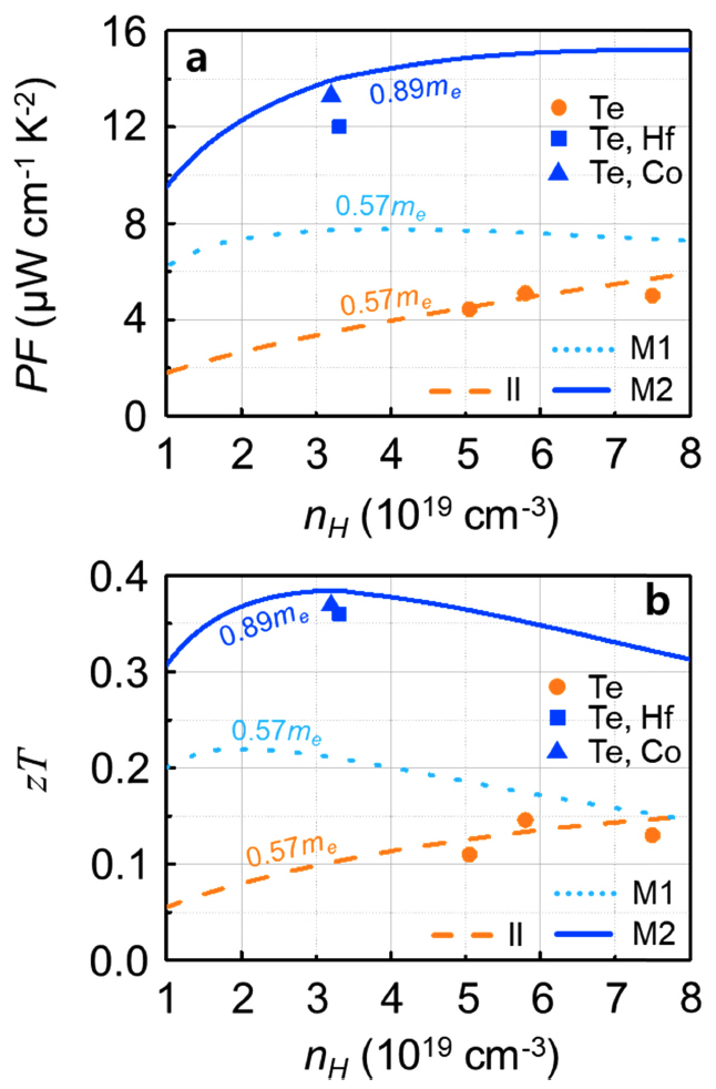 “Te”를 이론적으로 설명하는 “II” (md*= 0.57 me)와 “M1”(md* = 0.57 me)를 비교함으로써 가늠해 볼 수 있다. Te와 전이금속의 동시 도핑을 통해 캐리어 산란 메커니즘과 md*를 동시에 제어할 경우 nH ~ 3 × 1019 (cm-3)에서 약 3.5 배의 파워 팩터 증대 효과가 있지만 (“II”→ “M2”), 캐리어 산란 메커니즘 제어 효과만 고려할 경우, 동일 nH에서 파워 팩터는 약 2배 증대하는 것에 그친다(“II”→ “M1”). 그럼에도 불구하고 단순 캐리어 산란 메커니즘 제어를 통해 약 2배의 파워 팩터