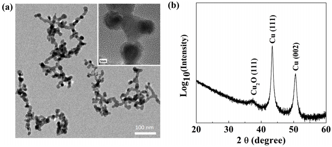 shows copper nanoparticles bonded to each other. (b) XRD pattern of the nanoporous