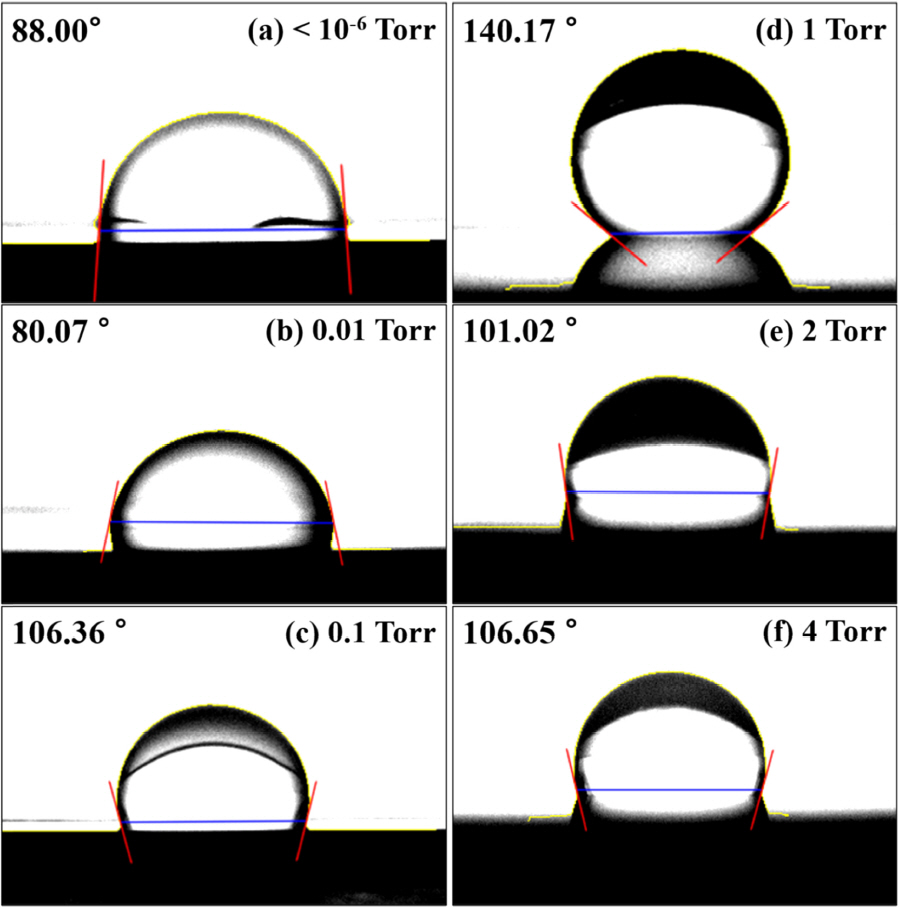 Contact angles of copper nanostructure deposited at different pressure: (a) < 10-6 Torr, (b) 0.01 Torr, (c) 0.1 Torr, (d) 1 Torr, (e) 2 Torr, (f) 4 Torr. Contact angles