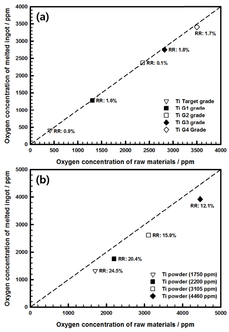 Variation in oxygen concentration of melted ingots prepared from (a) bulk titanium