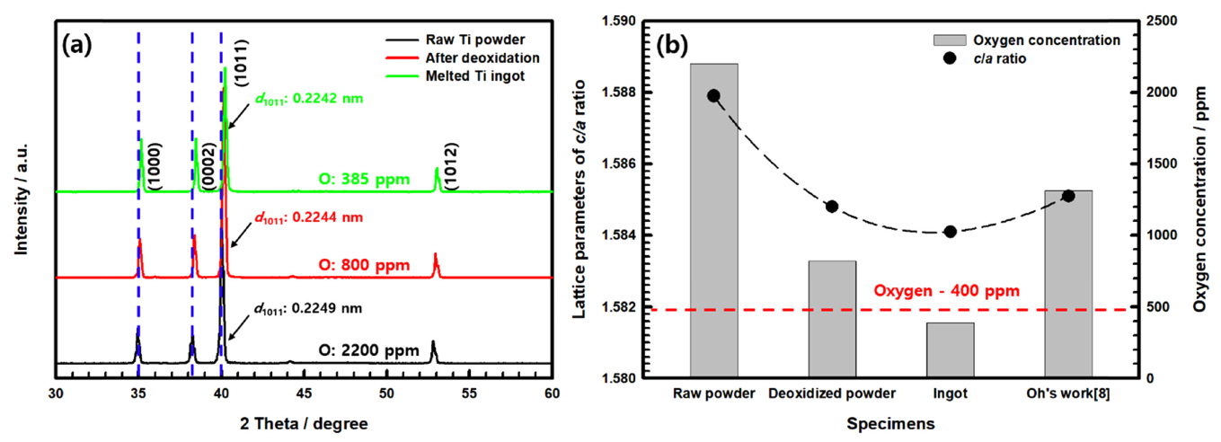 spacing (d1011) within the lattice of the deoxidized titanium powder and ingot is considered to