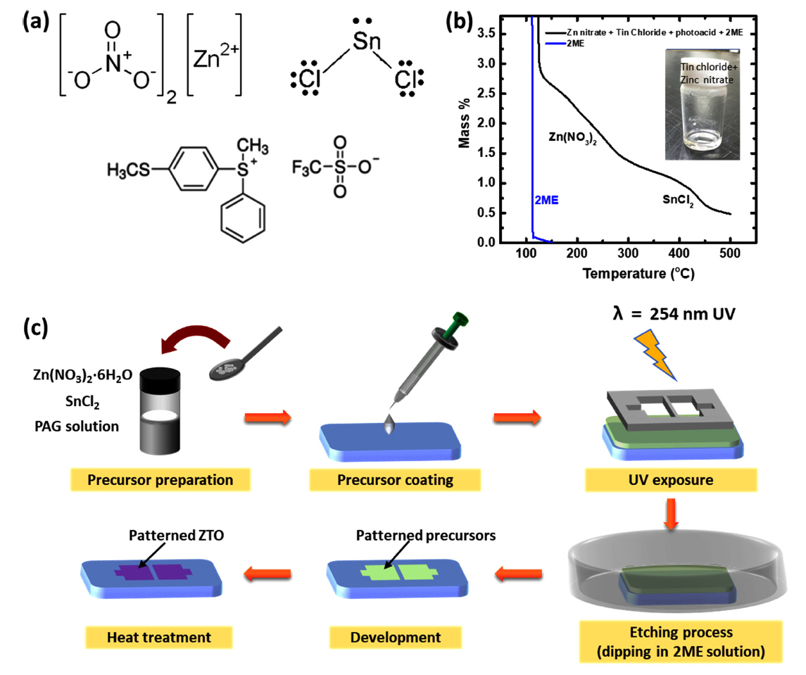 본 연구에서는 ZTO 전구체 용액에 PAG를 첨가하여 별도의 포토레지스트를 활용하는 복잡한 포토리쏘그래피 없이 전구체 박막이 자외선 조사에 의해 자가패턴