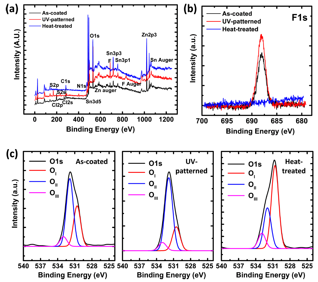 of as-coated ZTO precursor film, UV-patterned precursor film, and heat-treated ZTO