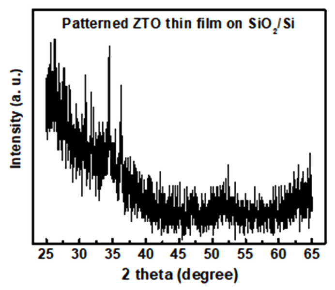 그림 4는 열처리한 ZTO의 XRD 분석 spectra 결과이다 (Cu-Kα radiation, λ = 1.5406 Å). SiO2/Si 기판에 PAG가 포함된 ZTO 산화물반도체 전구체 용액을 코팅 한 후 450 °C, 1 h 열처리 후 XRD pattern을 측정하였다. 2Ɵ