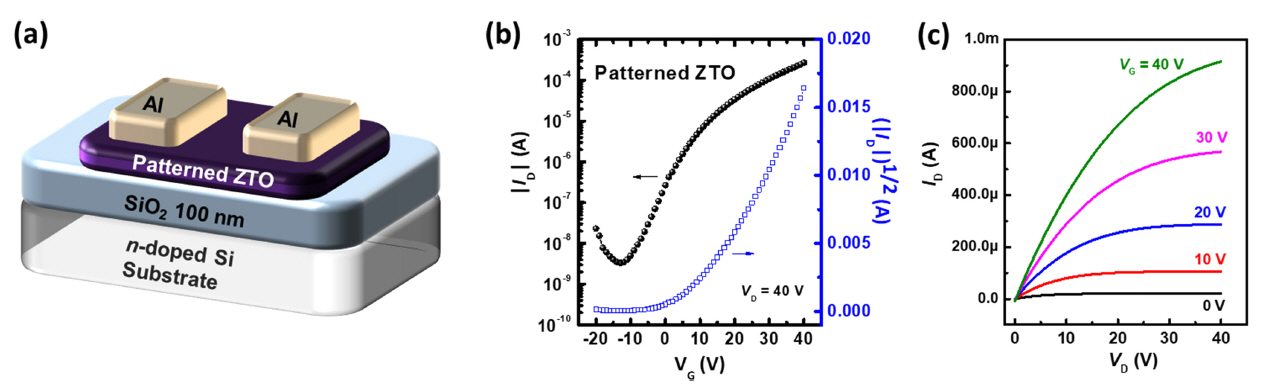(VD = 40 V) and (c) output characteristics of ZTO TFTs prepared from photo-patternable