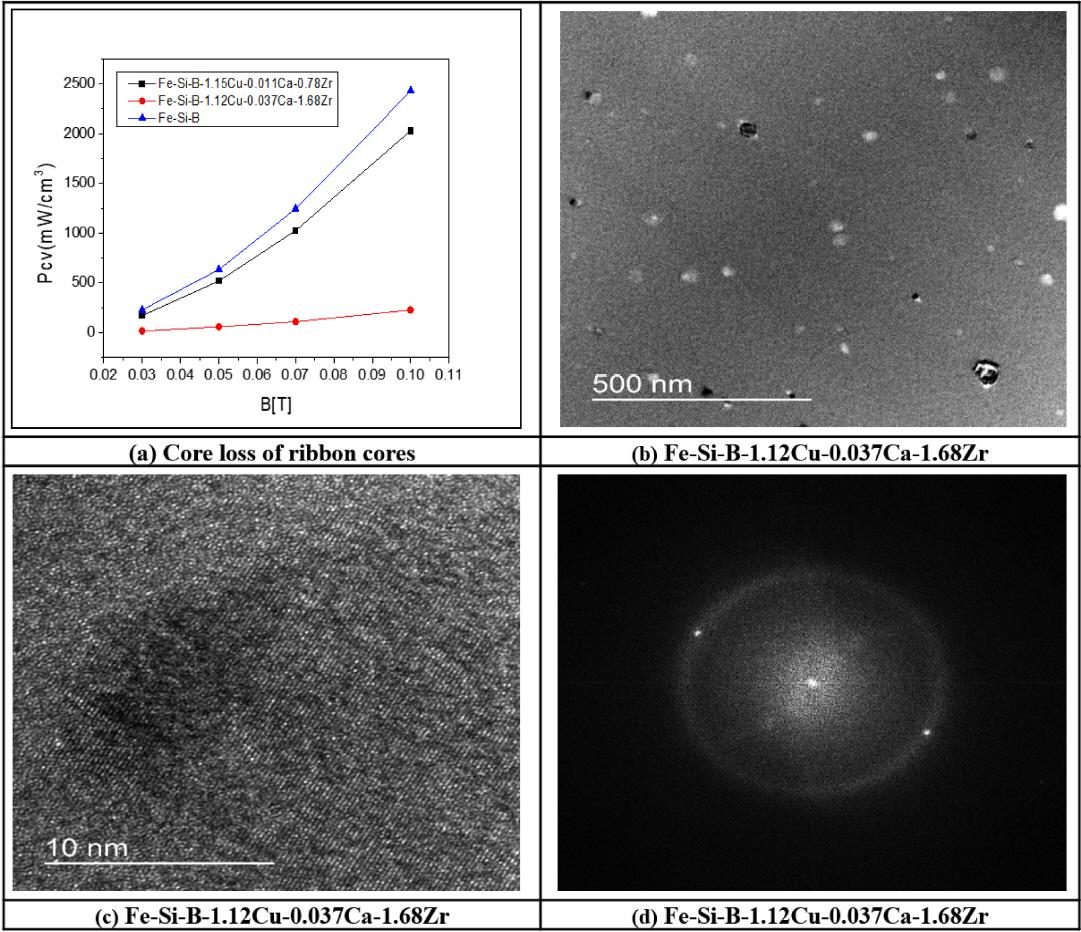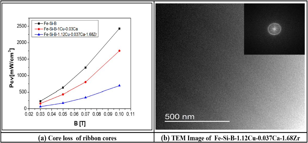 분석되는데, 이 합금리본코어의 코어로스(Core loss) 감소는 첨가된 Ca이 결정립계에 분포하여 절연역할을 함으로써 전기저항이 증가하고, Zr의