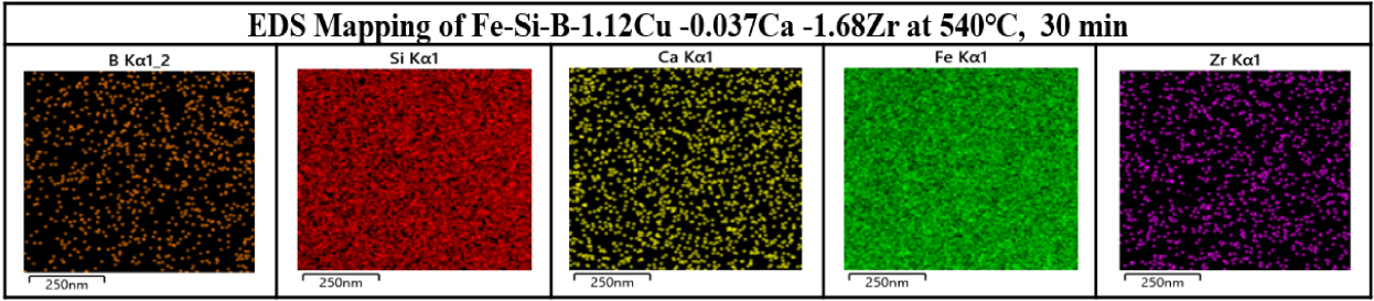 한편, 본 연구실의 사전 연구로 발표된 결과 [8]에 의하면, Ca와 Zr이 비교적 많이 첨가된 Fe-Si-B-1Cu-0.19Ca-2.48Zr 합금리본을 540 °C에서 30분간 열처리한 경우가