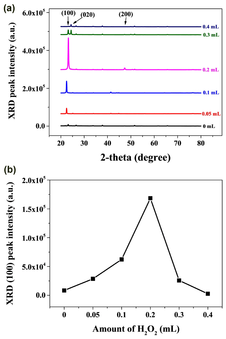 그림 2는 WO3 광전극의 구조적 특성 분석을 나타낸 것이다. 그림 2(a)는 H2O2 첨가량에 따른 WO3 광전극의 XRD 스펙트라를 나타낸 것이다. WO3 광전극의 (100), (020), (200) 면을 의미하는 피크들이 각각 23.21 °, 24.38 °, 47.44 ° 부근에서 확인되었다 (ICSD