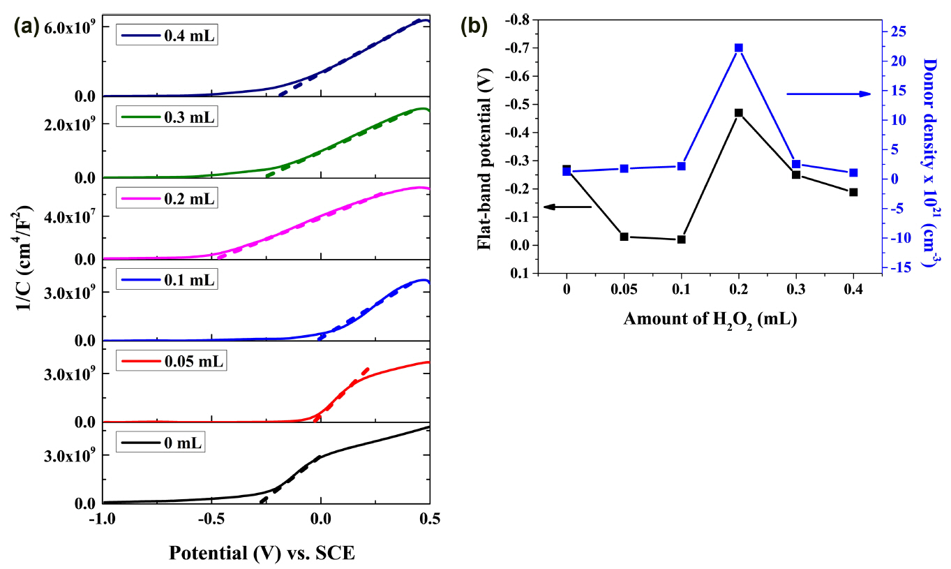그림 5(a)는 H2O2 양에 따라 증착된 WO3 광전극의 Mott-Schottky 플롯을 나타낸 것이다. 그리고 그림 5(b)는 flat-band potential과 donor density 값을 나타낸 것이며, 이는 그림 5(a) 그래프와 식(1)을 통해 구하였다.