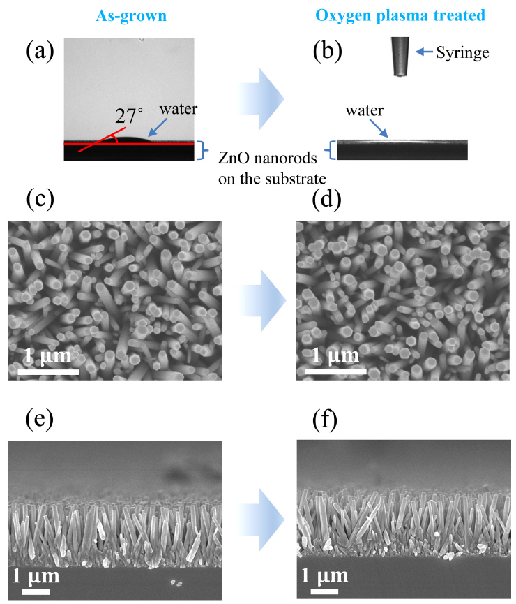 Meanwhile, Fig 3(c) and (e) show a top and a side view of the as-grown ZnO nanorods, respectively. Fig 3(d) and (f) correspondingly depict a top and a side view of the oxygen-plasma-treated ZnO nanorods,