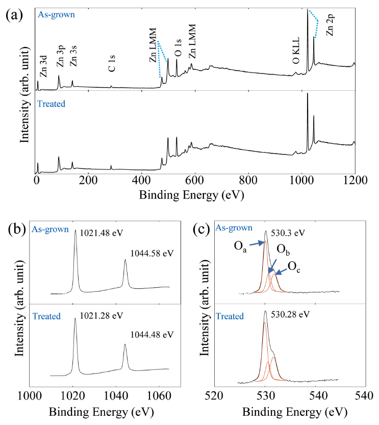 Fig 6 presents the XPS spectra of the as-grown and oxygen-plasma-treated ZnO nanorods to