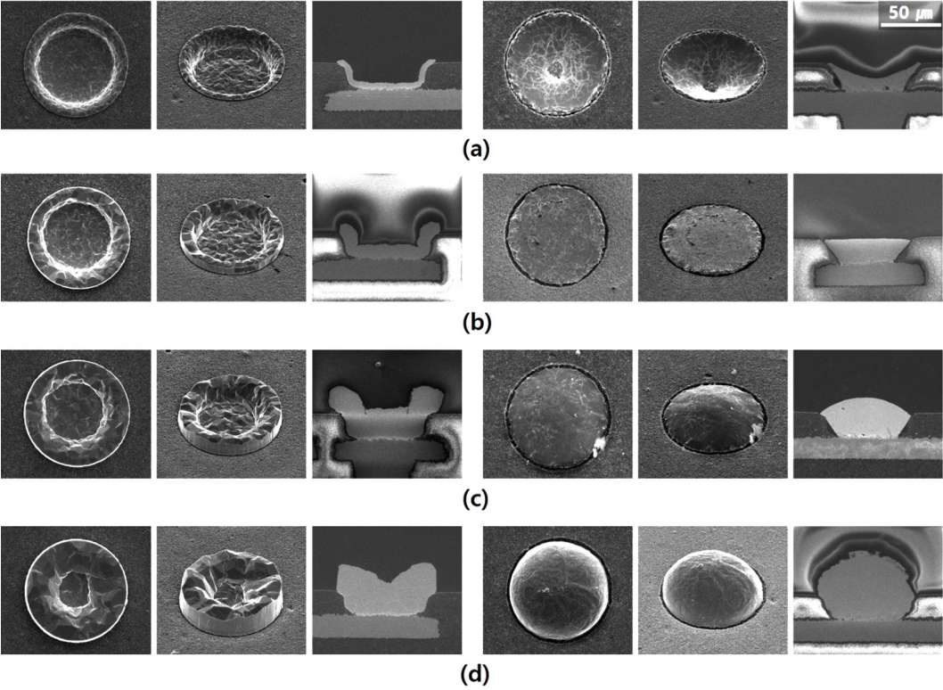 처리 후에 15분 도금한 시료에서는 아래로 꺼져 오목한 것이 관찰되며 Sn 도금량이 증가함에 따라 위로 볼록해짐을 알 수 있다. 이전의 Cu 필라