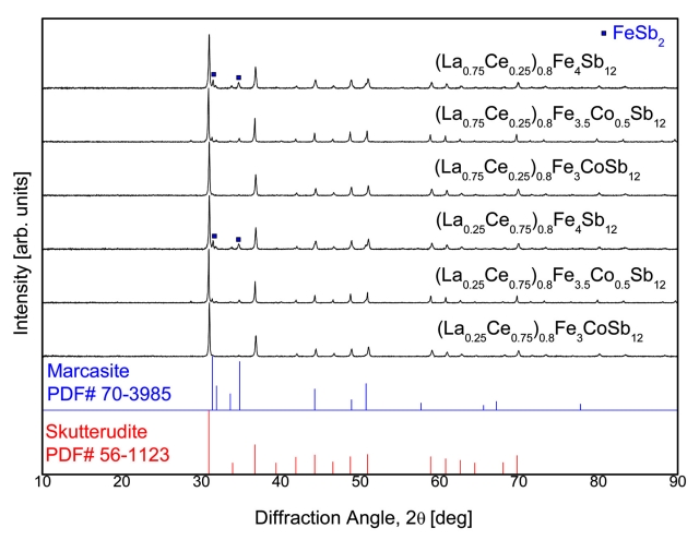The XRD patterns of the hot-pressed (La1-zCez)0.8Fe4-xCoxSb12 specimens are presented in Fig 1. All the diffraction peaks matched the ICDD reference data (PDF# 56-1123) for the