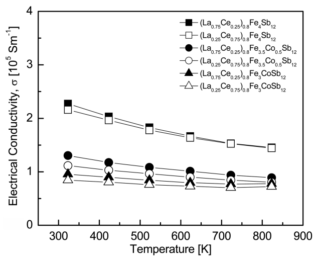 The electrical conductivity of (La1-zCez)0.8Fe4-xCoxSb12 is presented in Fig 3. The electrical conductivity exhibited a negative temperature dependence, that is,