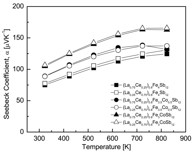 A minimum Seebeck coefficient of 124.5 μV K-1 was obtained at 823 K for (La0.75Ce0.25)0.8Fe4Sb12, but the maximum Seebeck coefficient of 165.4 μV K-1 was achieved at 823 K for (La0.25Ce0.75)0.8Fe3CoSb12. The Seebeck coefficients of the fully filled La1-zCezFe4-xCoxSb12 specimens exhibited maximum values at 723‒823 K, and La0.25Ce0.75Fe3CoSb12 exhibited the highest value of 164.1 μV K-1 at 823 K [22]. However, in this study, the Seebeck coefficient did not significantly increase