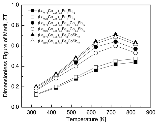 The dimensionless figures of merit (ZT) of (La1-zCez)0.8 Fe4-xCoxSb12 are presented in Fig 7. As temperature increased, ZT values increased; the Co-free specimens showed maximum