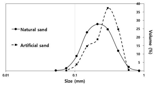 분포가 0.105~0.595 mm로 넓은 범위에 걸쳐 분포해 있으나, 인공주물사의 경우 0.149~0.351 mm로 천연주물사에 비해 입도 분포 범위가