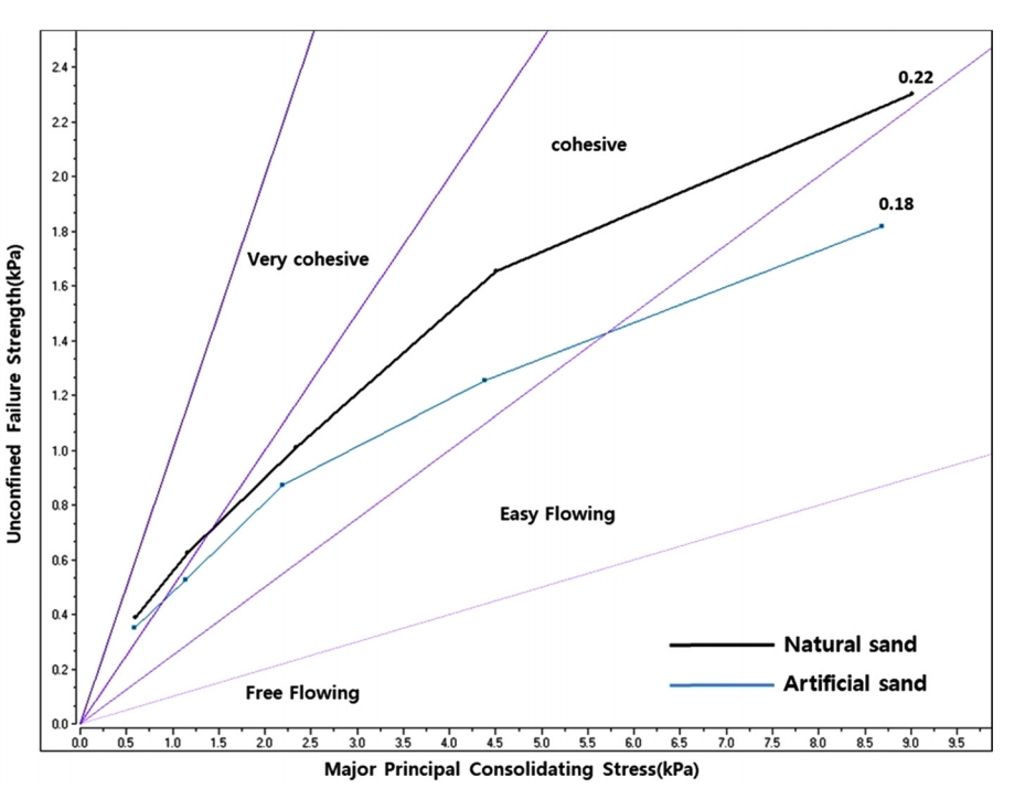 유동함수를 구성한다 [16]. 이렇게 측정된 flow function 그래프는 consolidating stress가 증가함에 따라 failure strength가 증가하는