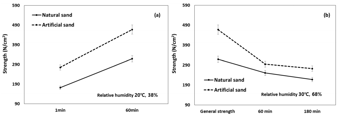 38% 습도 분위기에서 1분과 50분 동안 방치한 후 초기강도와 일반강도를 측정하였고 절대습도 29.9 g/cm2에서 1시간, 3시간 방치 후 흡습강도를 측정하여 그림 4에 나타내었다. 그림 4(a) 값으로 보면 금형 탈형 직후라 할 수 있는 초기강도(1분 강도)는 천연주물사 172 N/cm2, 인공주물사 275 N/cm2로 인공주물사가 약 100 N/cm2 높게 나타났으며, 50분 후 일반강도는 천연주물사 319 N/cm2, 인공주물사는 467 N/cm2로 약 1.4배 증가하는 것으로 나타났다. 반면 29.9 g/cm2 절대습도에서 방치할 시 강도는 시간이 지날수록 감소하여 3시간 후 강도는 천연주물사 217 N/cm2 인공주물사 272 N/cm2로 초기 강도보다 조금 높거나 유사하게 측정되었다. 천연주물사의 경우 흡습 분위기에서 약 14% 강도 저하가 나타났으며, 인공주물사는 약 28% 강도가