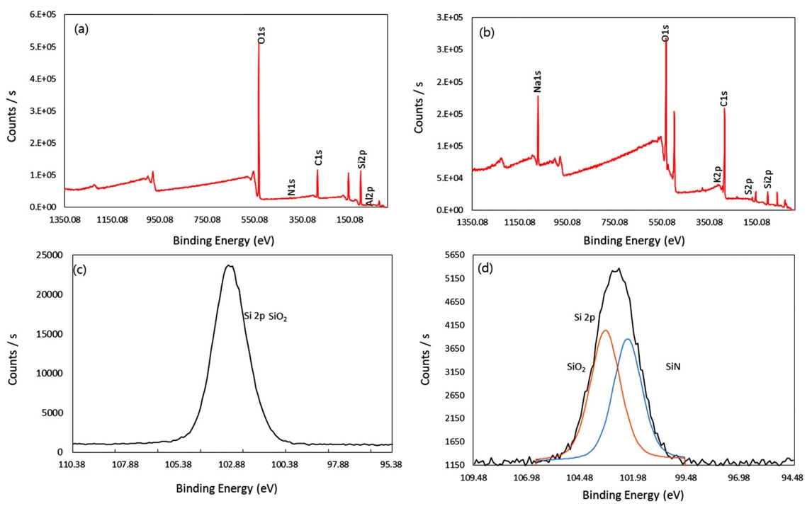 with mixed inorganic binder, (c) photoelectron spectra of SiO2 aerogel of natural sand and (d) photoelectron spectra of SiO2 aerogel of natural sand with mixed inorganic binder.