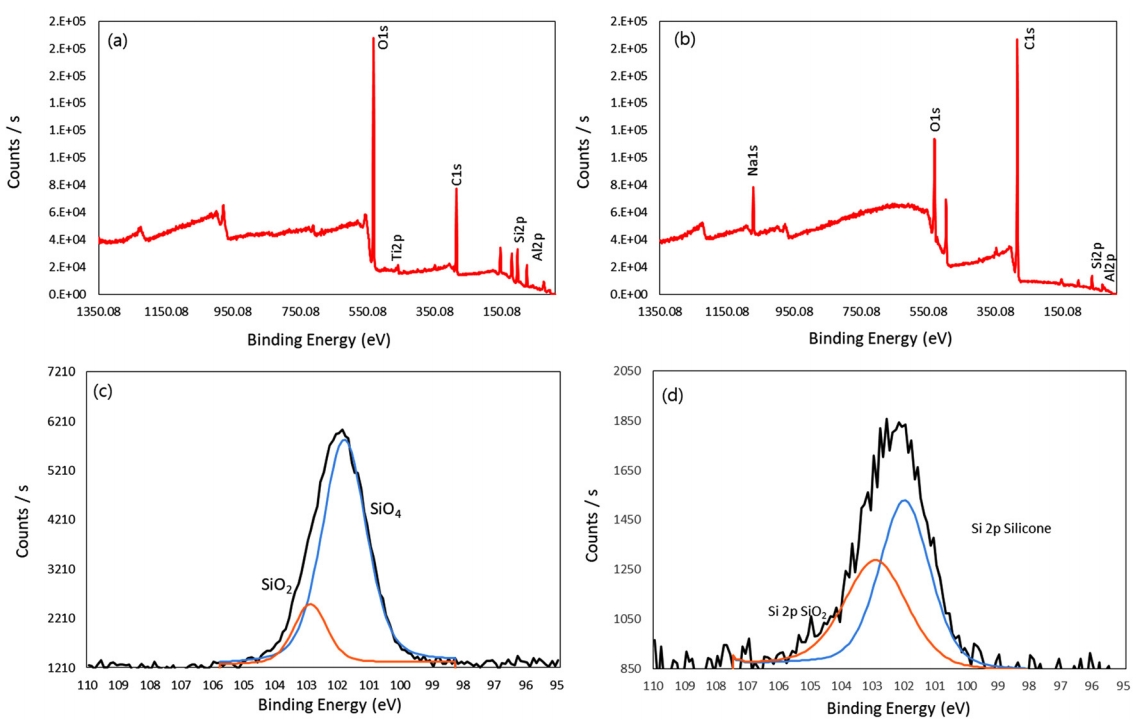 sand with mixed inorganic binder, (c) photoelectron spectra of SiO2 aerogel of artificial sand and (d) photoelectron spectra of SiO2 aerogel of artificial sand with mixed inorganic binder.