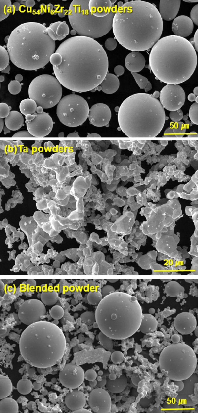SEM micrographs of (a) atomized Cu54Ni6Zr22Ti18 metallic glass powders, (b) Ta powders, and (c) blended powders.